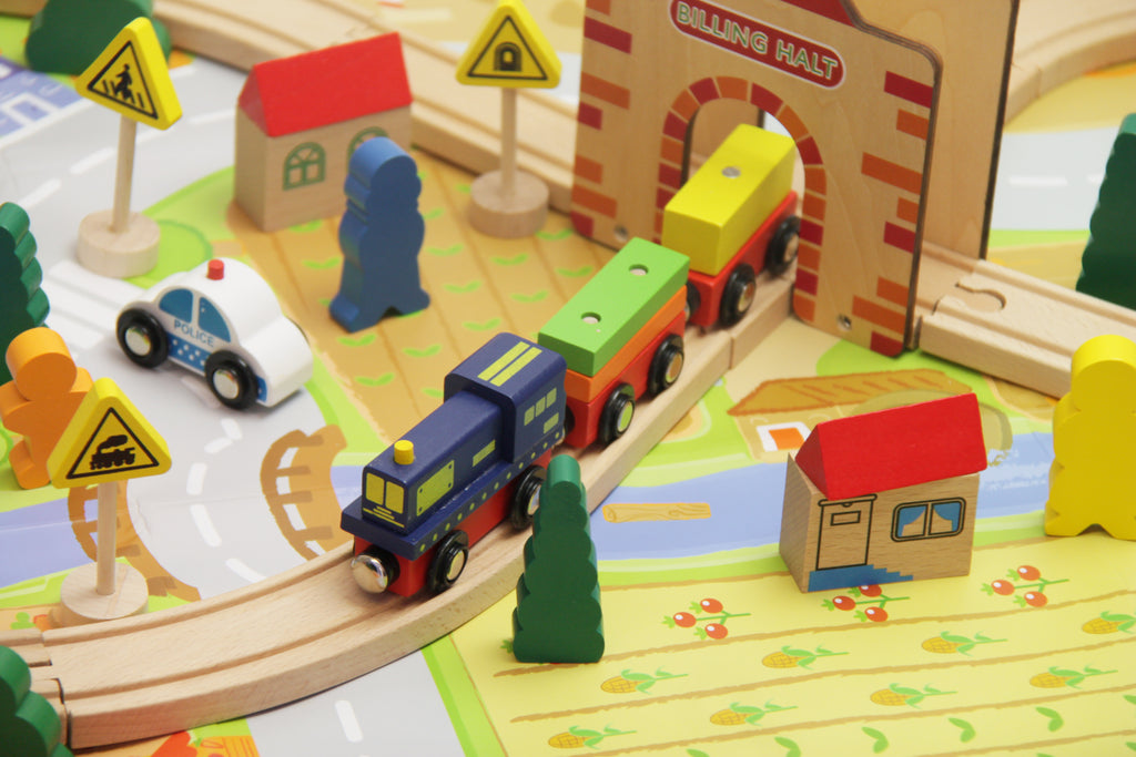 Combine learning and fun with this 54 piece Wooden Train Set. Your toddlers will enjoy driving the magnetic train set through trees, a bridge, and even a traffic signs! The 54 piece also includes 3 human figures, a house and plenty of track race parts for a longer railway track. It also comes with an instruction manual for multiple layouts.