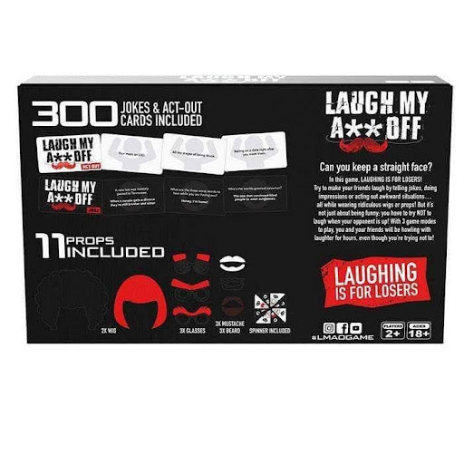 In this adult party game, laughing is for losers. Tell jokes or act out funny scenerios to try and make your friends laugh. Perfect to play with groups, at parties, or game night. This game is not intended for children. Includes 300 joke/act-out cards and 11 props. Drinks not included, though recommended. Laugh My Ass Off is inspired by the “bad dad jokes” and “try not to laugh challenge” trends on social media, in which two individuals would take turns telling each other jokes, and the person receiving the joke tries not to laugh. In the online trend, when a joke Teller makes the other person laugh, he earns a “laugh point.” with laugh My face off, this fun play pattern was modified and turned into a game that can be played with a Group of friends or one-on-one in Laugh My Ass Off, the joke and act-out cards are geared towards a millennial audience. It's a party game meant to be played by teens and young adults that have a good sense of humor and aren't easily offended.