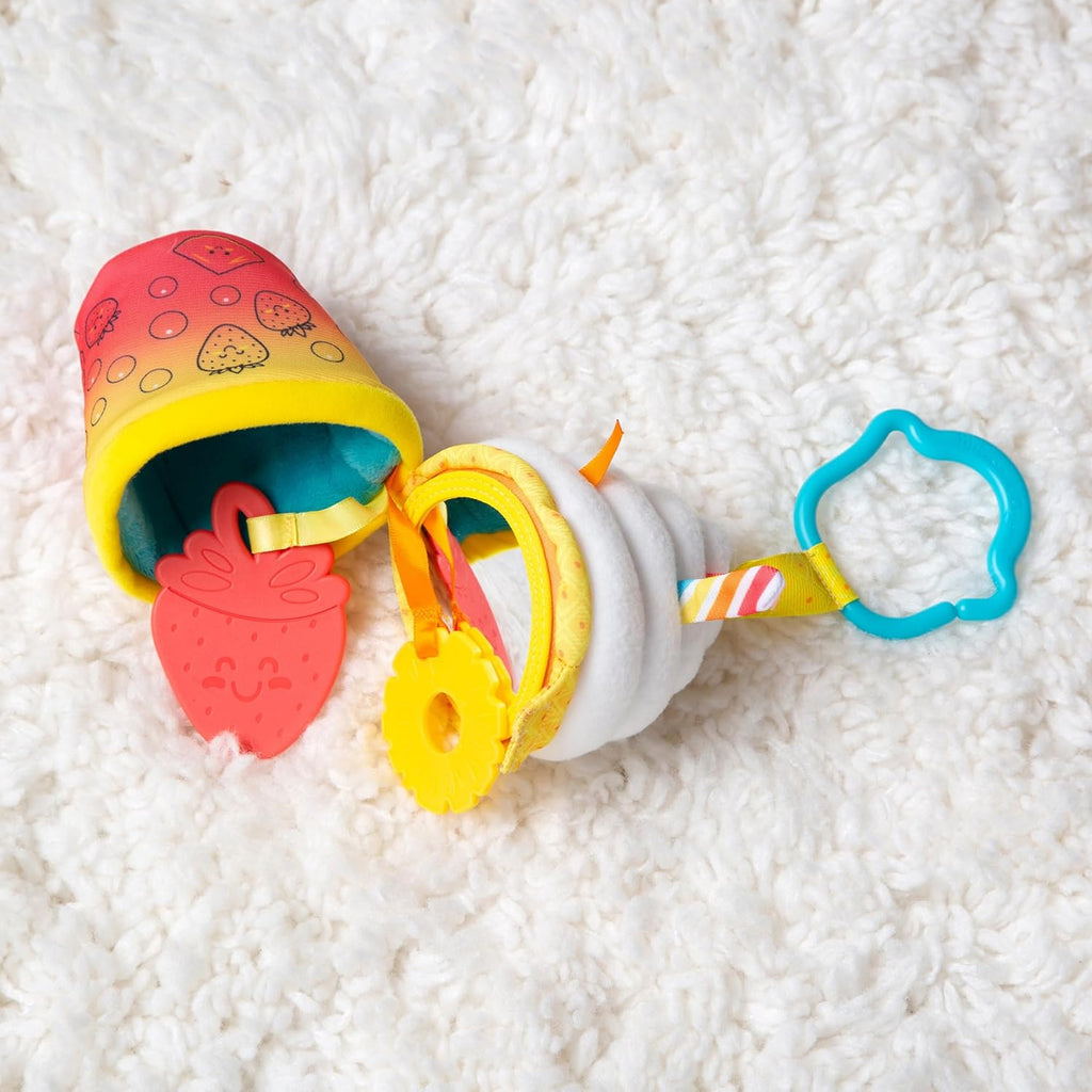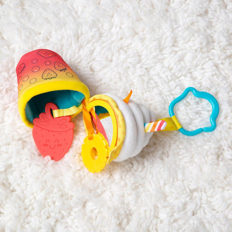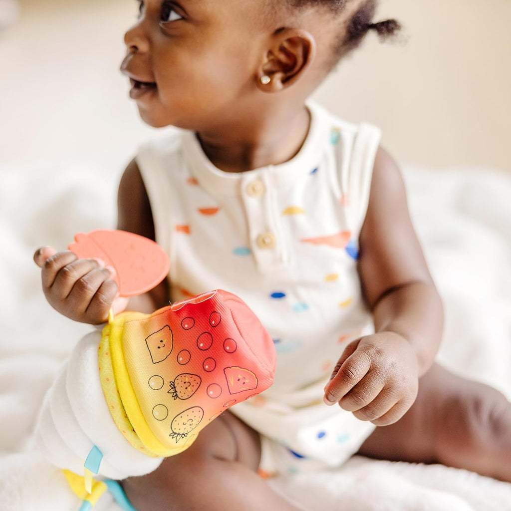 Engage your baby’s senses with the Melissa & Doug Bubble Tea Take-Along Toy. This soft, ombre fabric cup is easy for little hands to grasp and jingles when shaken. The squishy “whipped cream” top opens to reveal a peek-a-boo mirror, while textured pineapple and strawberry pieces invite tactile exploration. Clip this multi-textured five-piece toy onto strollers, car seats, or diaper bags for fun on the go. Designed to inspire discovery, it’s the perfect companion to keep your baby entertained and curious wherever you travel.