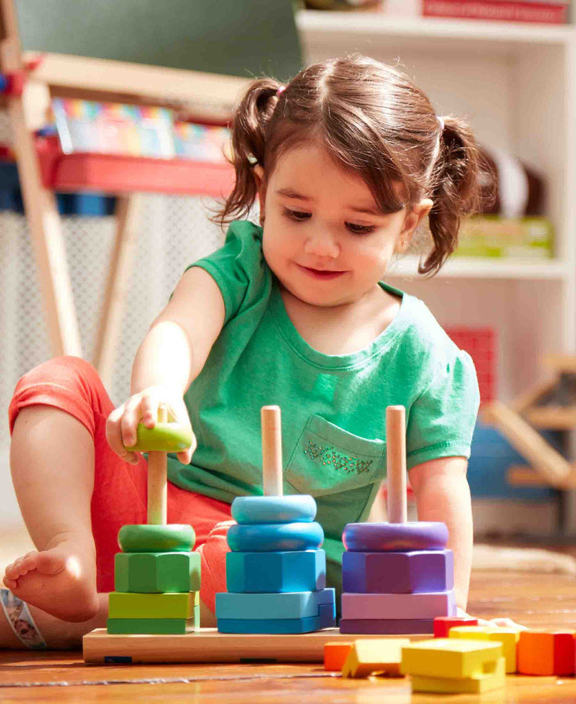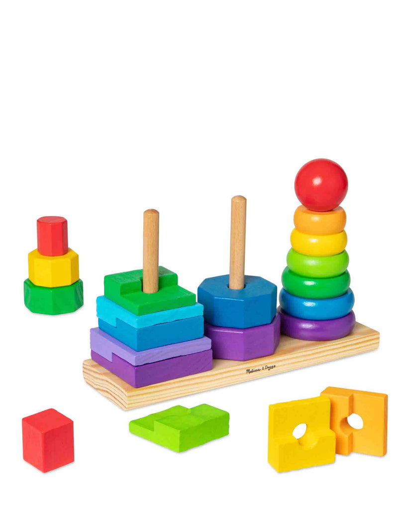 Match and sort these 25 colourful wooden pieces, and skill building is just part of the fun. Rings, octagons, and rectangles can be slotted onto the three rods, stacked on top of each other, or lined up to compare shapes, sizes, and colours. This first - concepts set is a manipulative all - star.