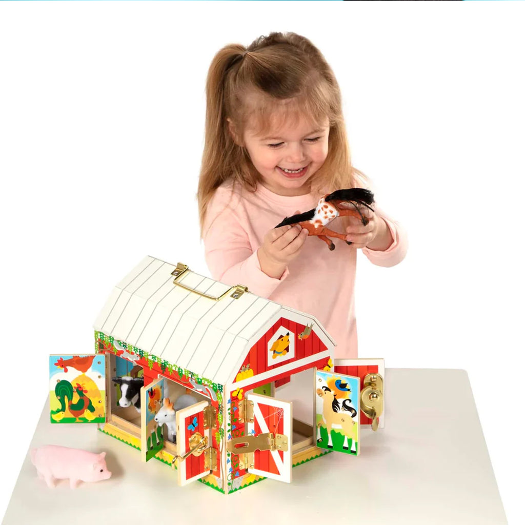 Discover endless fun with the Melissa & Doug Latches Barn! This sturdy wooden barn features six brass-hinged doors with working latches and locks, each revealing colorful farm animal pictures inside. Four flocked play figures—a cow, pig, goat, and horse—fit perfectly inside, encouraging imaginative play. The barn’s bright paint and brass handle make it easy to carry anywhere. Perfect for developing fine motor skills, color recognition, and animal knowledge, this charming toy brings the farm to life for your little one. Unlock creativity and learning with every latch!