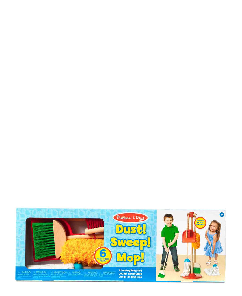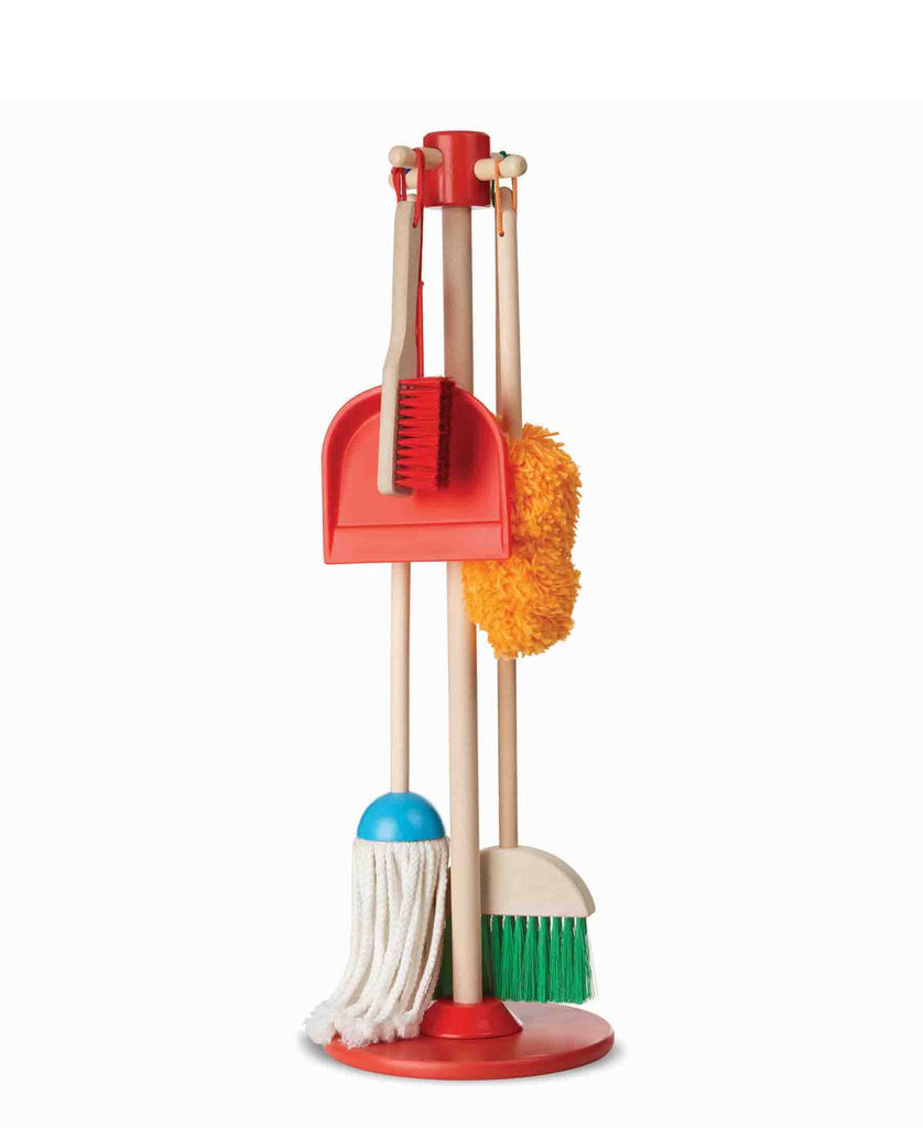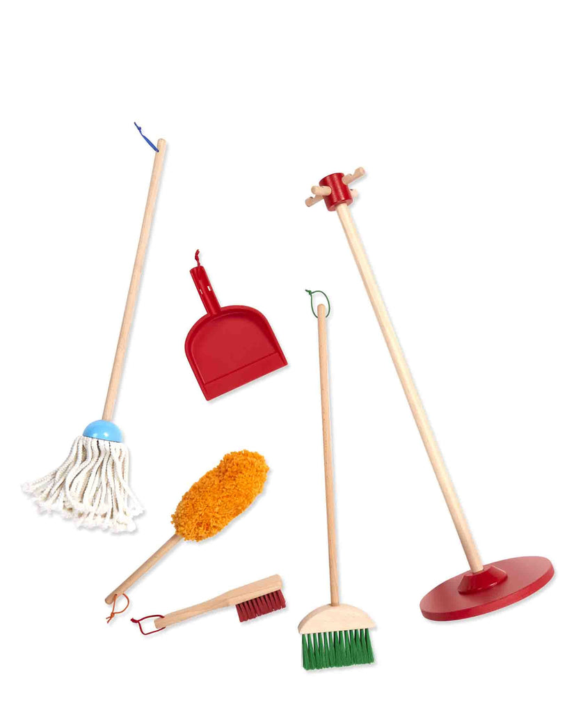This six-piece play set gives kids all the housekeeping tools they need to keep it clean! Sized just for kids and built to last, the broom, mop, duster, dust pan, and hand brush are comfortable to use and easy to store just hang them from the sturdy cords onto the included stand for neat, compact storage. (The dust pan can also snap onto any of the handles.) Natural-wood handles add durability and a classic look, bright pops of colour keeps lots of fun in the mix!