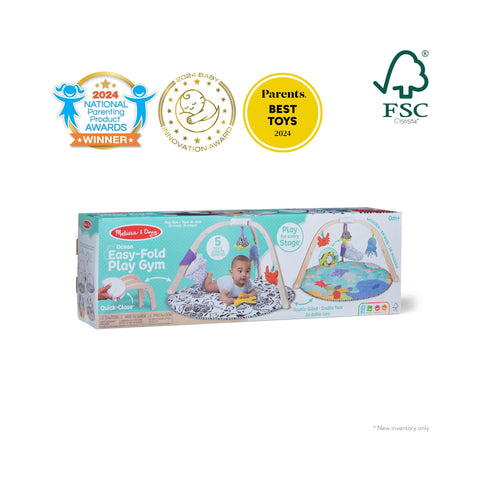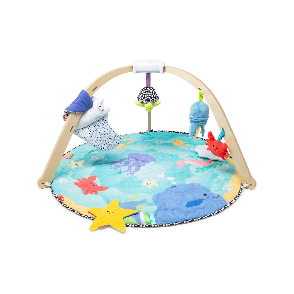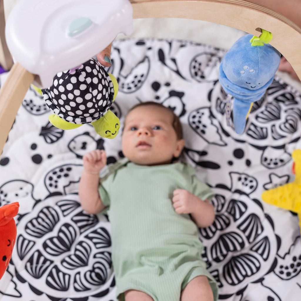 The Melissa & Doug Ocean Easy-Fold Play Gym offers a sturdy wooden frame with a wide opening for easy baby access and includes five attachable toys designed to support skill development. Its double-sided, machine-washable mat features high-contrast black-and-white graphics for early visual stimulation and a vibrant ocean scene with sensory ribbons and a crinkling clam shell to engage growing babies. This versatile play gym encourages exploration and learning through multiple developmental stages, making it an ideal choice for your little one’s playtime.