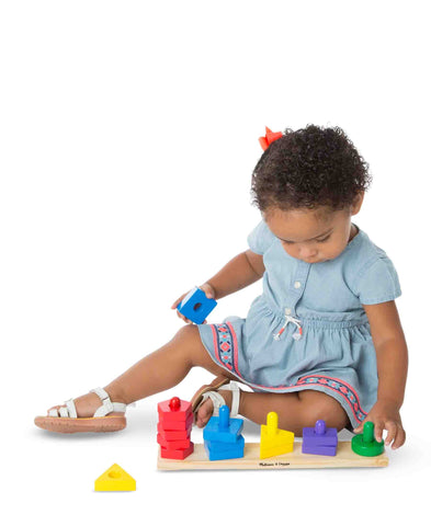 The 15 wooden pieces in this novel shape sorter offer a variety of colours, shapes, and opportunities for learning. Stack them on the pegged stand in order, mix up the shapes and colours, or create your own games with these engaging first manipulative. A printed key on the wooden base offers guidance when it's wanted, but the possibilities for play are endless. Use the colourful blocks to encourage sorting, matching, counting, stacking, dexterity, fine motor skills, colour recognition, and more. Recommended Age Range 2 Years and up
