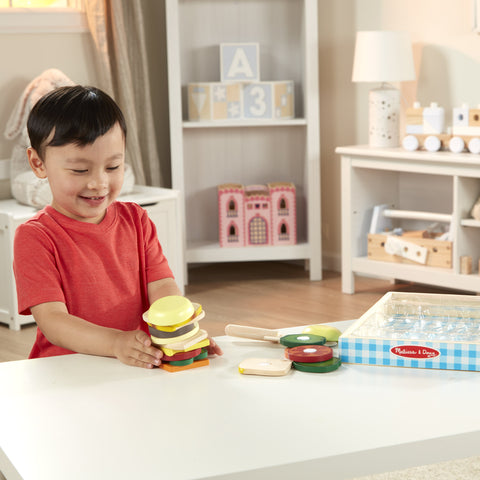 Create endless sandwich combinations with the Melissa & Doug Wooden Sandwich Making Play Set. Featuring 16 wooden "fixins" and a wooden knife that makes a satisfying crunch when sliced, this set encourages imaginative play and fine motor skills. The included wooden storage tray keeps everything neatly organized, making cleanup easy and playtime even more enjoyable. Perfect for little chefs who love to build and pretend!